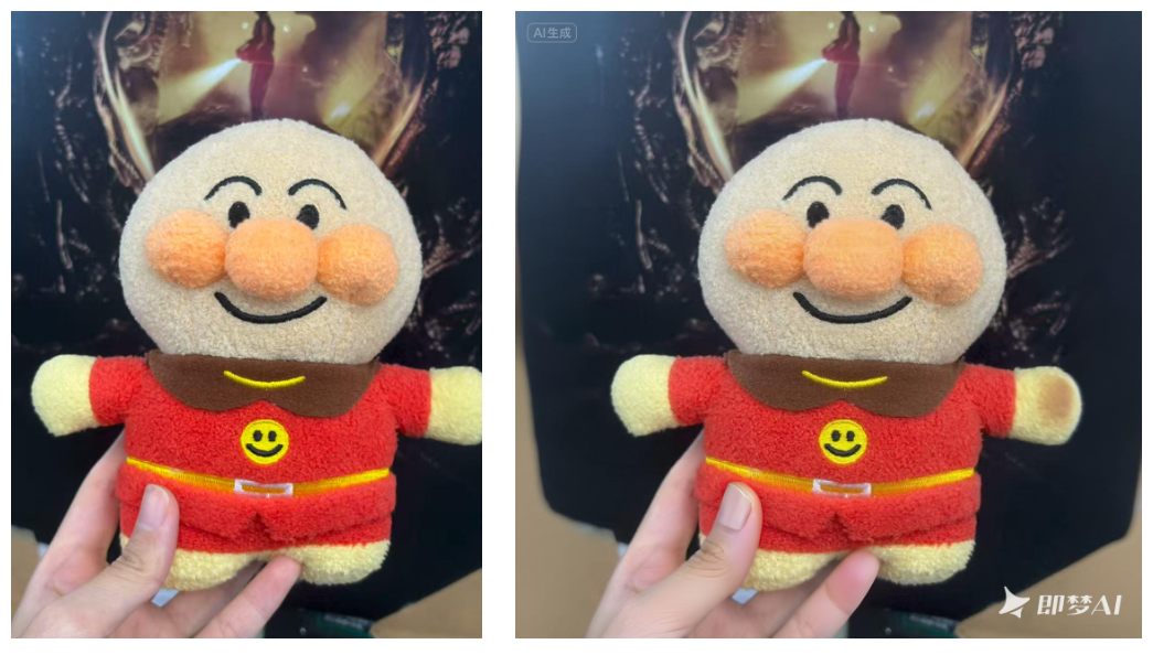 就比如世超隨手拍了一個玩偶,然後導入到圖片生成 AI 裏。輸入指令,弄髒手,玩偶手上就多了一塊污漬了。