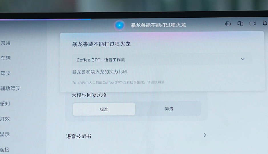 它似乎欲言又止了。不過測試下來之後,交流還算流暢,並沒有發生一本正經胡説八道的現象。不得不説,配上語言大模型的交互確實有趣,還能給我一些及時想要的信息反饋。當然除了上面這些花活,這套車機系統本身的流暢性也沒什麼問題 。各個功能也都基本上是秒點秒響,動畫也很跟手。