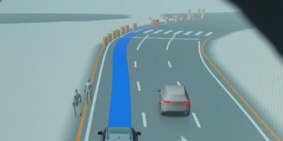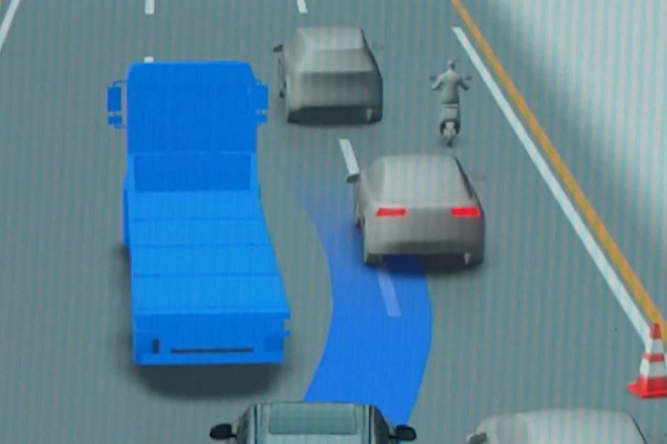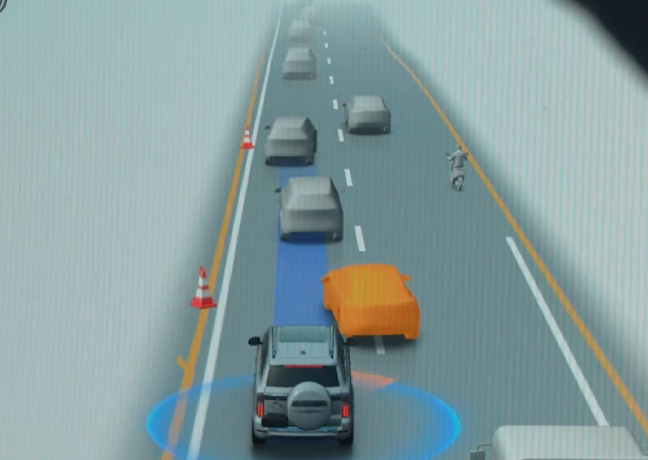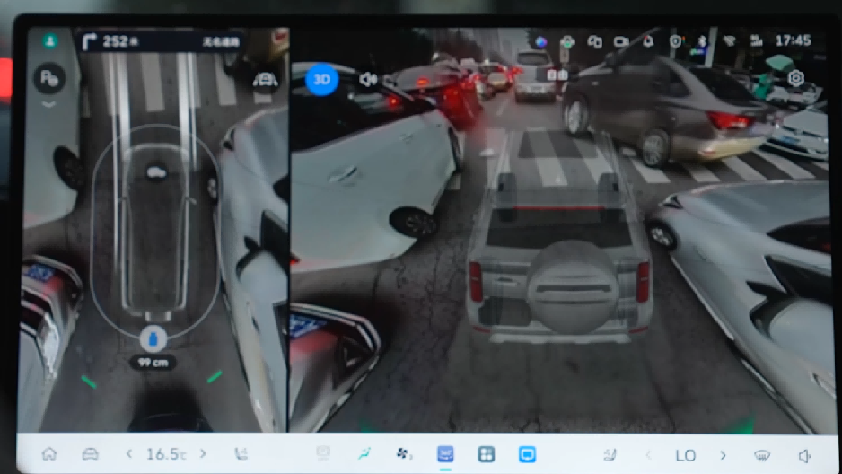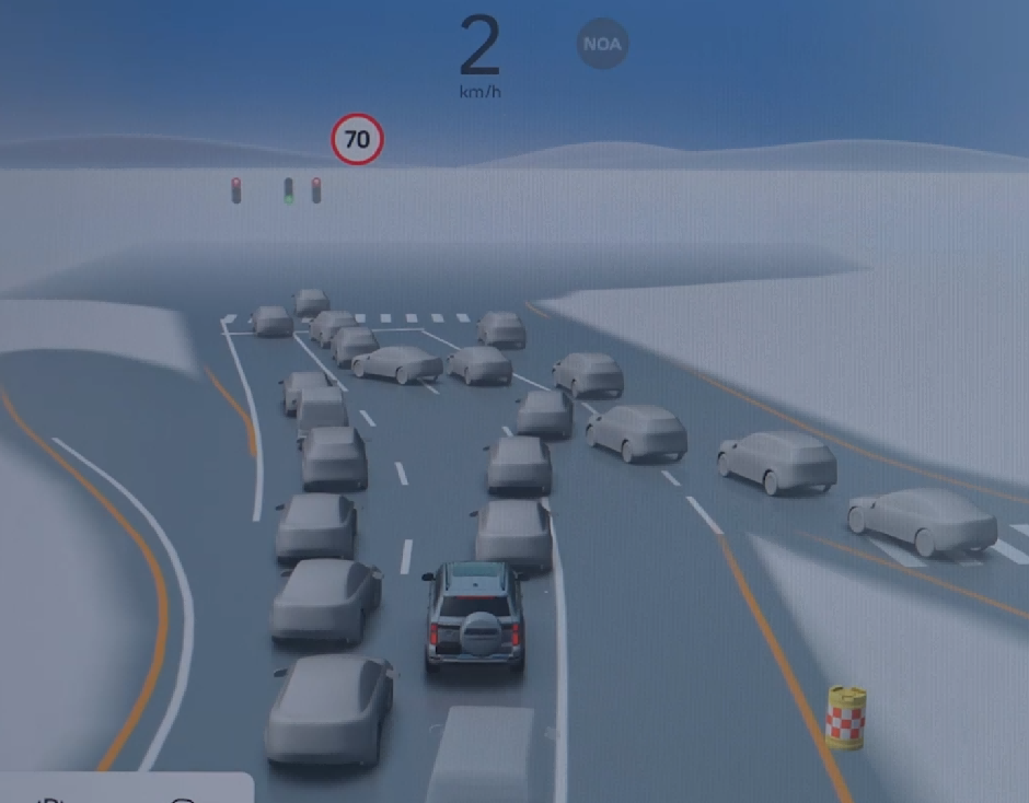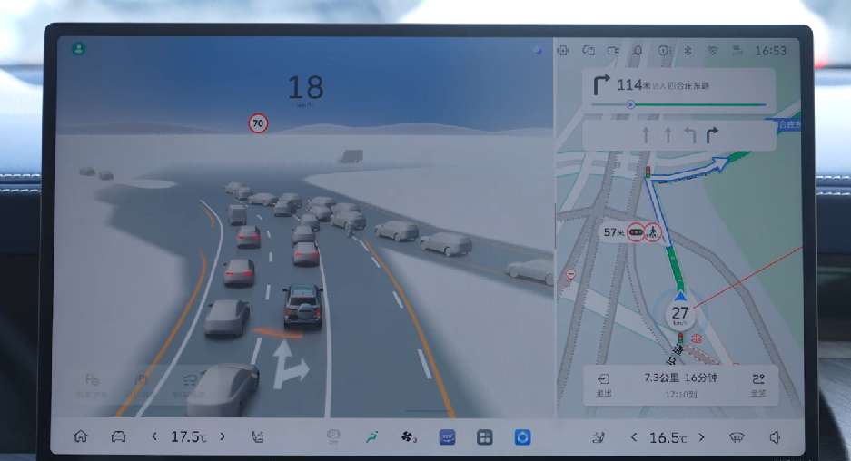 但我們通過儀表屏看到,雖然實際道路沒有劃線。但系統已經腦補出了車道線,並且很遠的距離,就感知到了前方斜停的大貨車。右側的錐桶識別的也很到位,從而提前開始減速,規劃下一步動作。但由於右側超越車輛眾多,最終還是選擇了最穩妥的方式。這裏我不得不提一下,連旁邊車輛的剎車燈都能識別清楚。