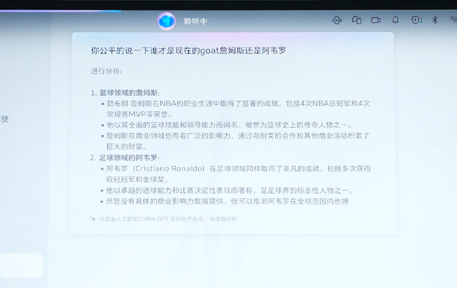 哎,就很智能,另外你的聲紋還可以關聯車控,這樣就只有已經註冊聲紋的用户,才可以語音控制車窗,天窗等等跟行車安全有關的調整。除了語音控制,它現在還支持語音大模型,所以當你遇到一些,怎麼也想不明白的問題時,不妨來問問它 。