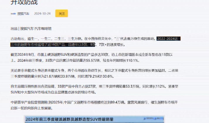 單單2022年-2024年,猛增了19款新品。且逐年以3款、9款、7款+的速度增長。如果説幾年前的“方盒子”“大梁”“差速鎖”還只是國產越野車的新手村起步階段。