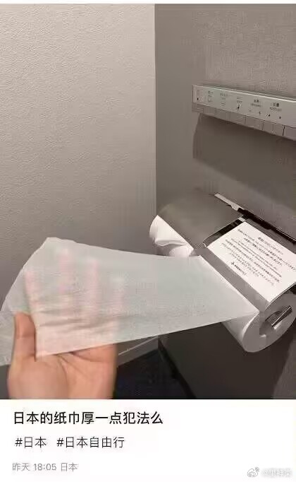 然而,唯獨廁紙這一點,總會令不少初來乍到的旅客感到一絲違和:為什麼日本的廁紙這麼薄?薄得幾乎透光,摸起來甚至不如普通的餐巾紙厚實,不少人開玩笑説,“這是在考驗使用者的技巧”。