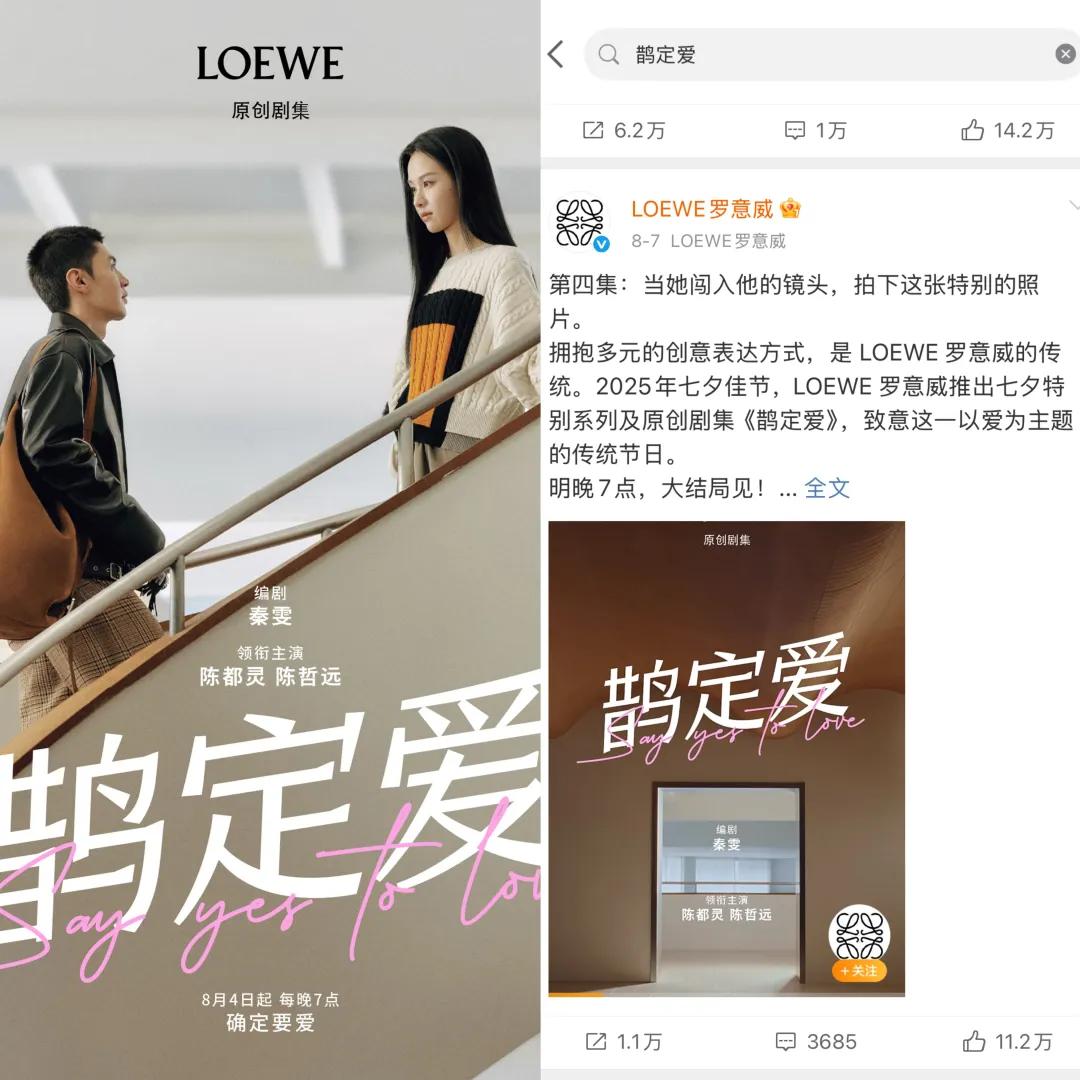 面對傳統大片完播率走低、用户對精美畫面逐漸免疫的現狀,今年LOEWE開始轉向時下熱門的短劇形態,推出了由陳都靈、陳哲遠主演的五集短劇《鵲定愛》。儘管本質上仍是明星演繹愛情故事,但短劇集的內容形式,確實在一眾常規短片中通突出重圍,在社交媒體上贏得了更高關注度和話題度。再加之短劇邀請了《繁花》編劇秦雯負責劇本,以懸疑手法重新解構愛情議題,雖是短劇但也能保證內容的品質調性。