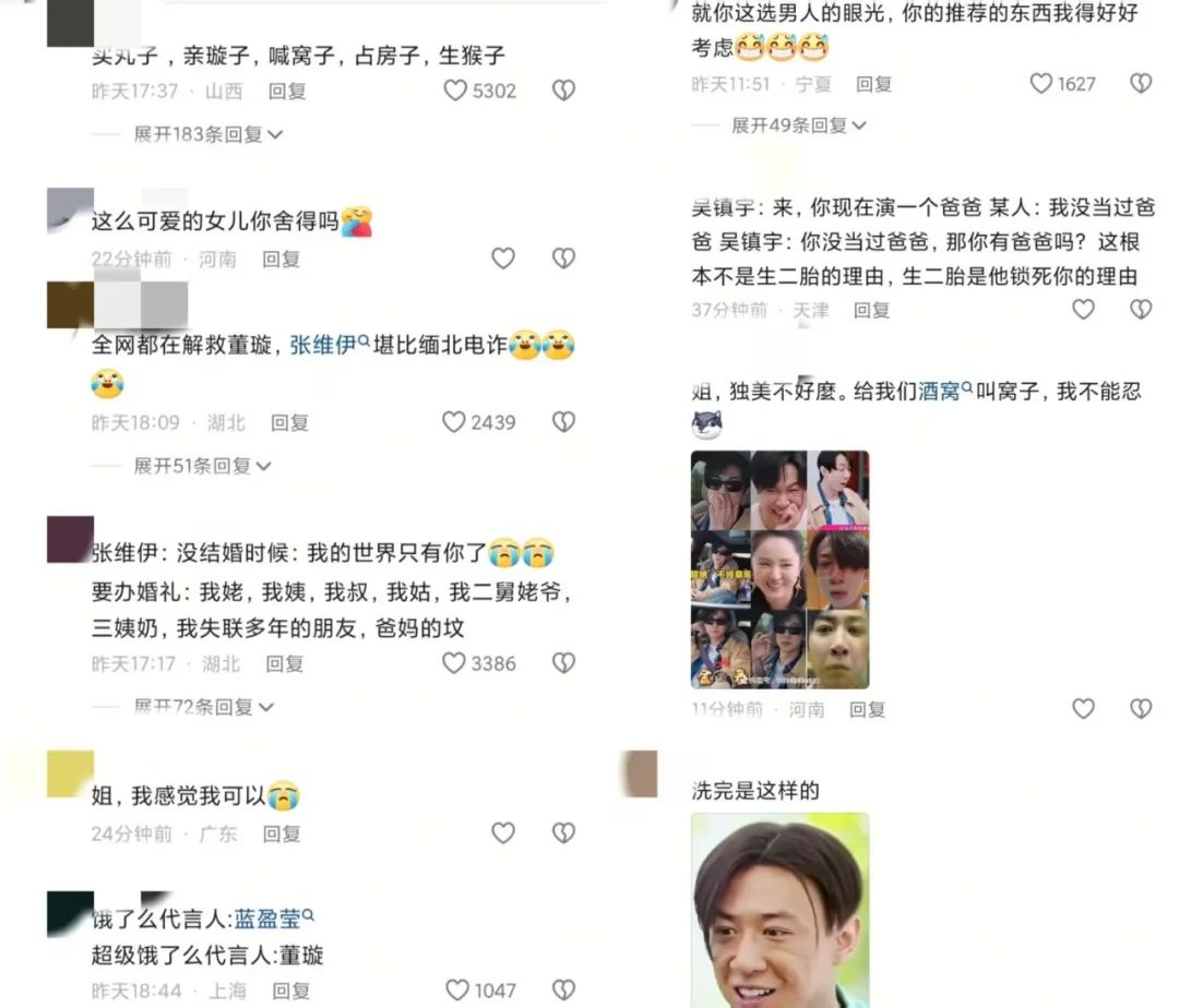 這種不滿隨着張維伊表示自己創作遇到了瓶頸,希望有個孩子來讓他來體驗父親的身份,讓45歲的董璇高齡產子時達到了頂峯。之後,網友開始細節化地模仿張維伊的動作神情,記錄他的語錄,跑去他的社交媒體賬號下為董璇鳴不平,甚至,連節目中,張維伊隨時佩戴的耳機也扒到了品牌,有網友跑去找商品客服進行確認。目前,節目已經將耳機打碼處理。
