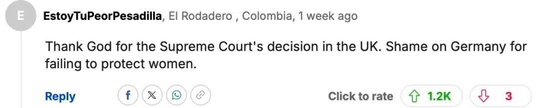“感謝上帝,英國最高法院做出了保護生理性別這樣的判決。德國未能保護女性,真是可恥。”