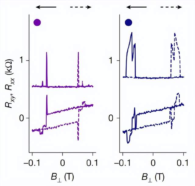 讓我們回到菱方石墨烯,在這種ABC堆垛方式的石墨結構裏,大家發現不同堆垛層數會直接影響材料的性質,特別是對實現拓撲保護的電子態和超導的形成至關重要。在嘗試了各種層數的菱方石墨烯之後,來自美國麻省理工學院的研究人員終於發現四層和五層石墨烯可以存在穩定的手性超導現象,其最高轉變温度達到了300 mK,也就是0.3 K。儘管這仍是非常接近絕對零度的一個極低温,但讓科學家們感到激動的是,這類材料具有明顯的手性超導特徵,也就是進入超導態之後存在時間反演對稱性破缺,而且電荷密度非常低。這種軌道磁矩鎖定超導電流的狀態,最明顯的表現就是在零磁場附近的電阻也存在類似“磁滯回線”的行為。也就是正向和反向加磁場去破壞超導態的過程中,會出現的電阻正負號不同,相當於反常霍爾效應那種信號。而且,該材料的臨界磁場可以達到1.4 T,比其他類型的石墨烯超導要高,説明庫珀電子對有着強耦合效應,應用的潛力更大。