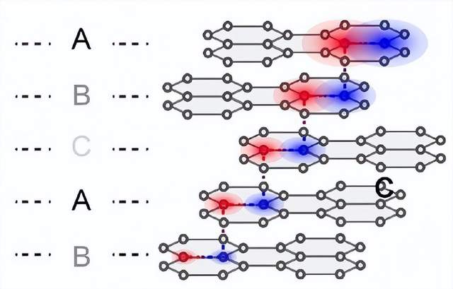 當然,石墨烯的玩法不僅限於這些。傳統石墨中的石墨烯堆垛方式一般叫作ABAB,也就是每層碳原子在垂直方向呈現錯位排列,然後交錯堆疊。轉角石墨烯則是兩層或多層石墨烯之間存在特定的轉角,結果就是導致原子分佈的週期被擴大了很多,也即存在所謂莫爾超晶格。兩者相互結合,就會出現石墨烯的另一種ABC的堆垛方式,常見於三層及以上石墨烯體系,各層碳原子沿特定角度旋轉,或者説相鄰碳原子層之間沿碳—碳鍵方向發生平移,整體形成菱面體對稱結構,這就是菱方石墨烯。菱方石墨烯的“魔性”更強,因為它在不同堆垛方式或轉角情況下可以呈現出豐富的量子物態,例如強電子關聯、超導、鐵磁、鐵電以及拓撲電子態等等。這一系列量子物態是新型量子器件和拓撲量子計算的重要基礎。