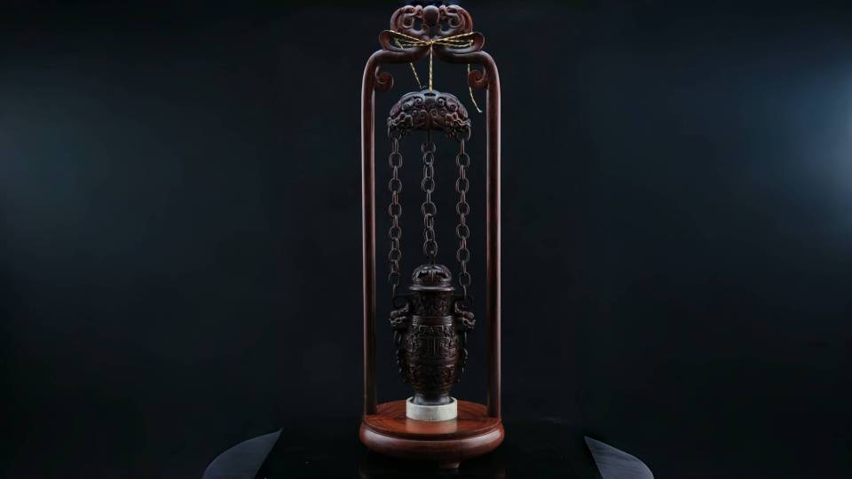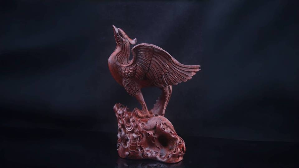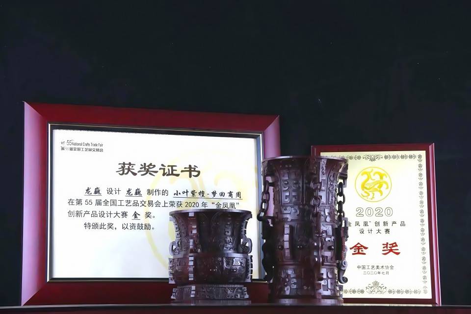 “紫檀夢迴商周”“紫檀螭虎三足樽”“海南黃花梨雲起龍驤香薰”……一件件脱胎於青銅、卻飽含木韻的作品相繼問世,在全國各大展評中屢獲殊榮。2020年,作品《紫檀夢迴商周》摘得第五十五屆“金鳳凰”中國工藝美術產品設計大賽金獎;2022年,他更在第六屆“醉根杯”全國工藝美術職業技能競賽中斬獲“工藝美術行業技術能手”稱號。至此,“湘作”木雕的版圖裏,祁東龍巍成為繞不開的名字。