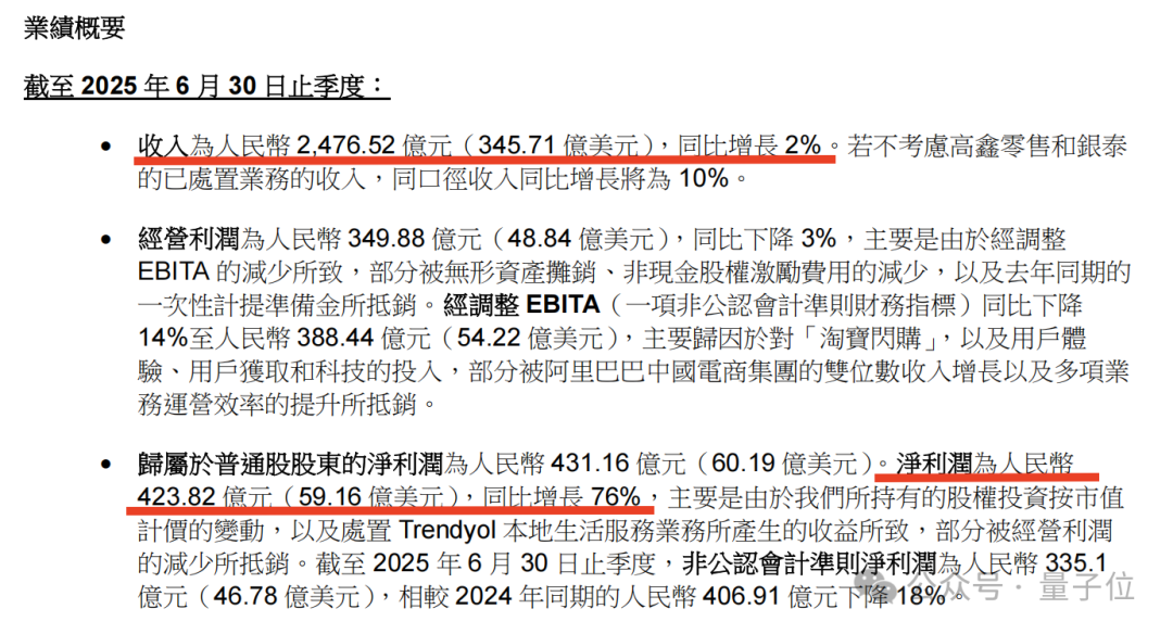 2025年第二季度,阿里巴巴總營收2476.5億元人民幣,同比增長僅2%,但淨利潤卻暴漲76%達到423.82億元。這種營收低增長與利潤高增長的巨大反差,反映出公司正處於戰略轉型的關鍵時期。