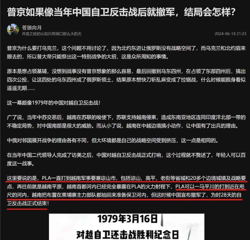 我在觀網曾經有一篇文章説的就是這件事。中國入朝、對印、對越等境外作戰都不是以“軍事侵佔”為目的的,關於這個問題我就不多展開了,如果這個區別都理解不了,那就不是裝睡了,而是根本就醒不來了……