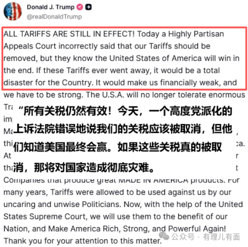 不過判決是下來了,但法庭也給了時間讓特朗普政府上訴——向美國最高法院提交受理請求。所以,在10月中旬前不會正式取消這些關税,關税暫時還在執行。