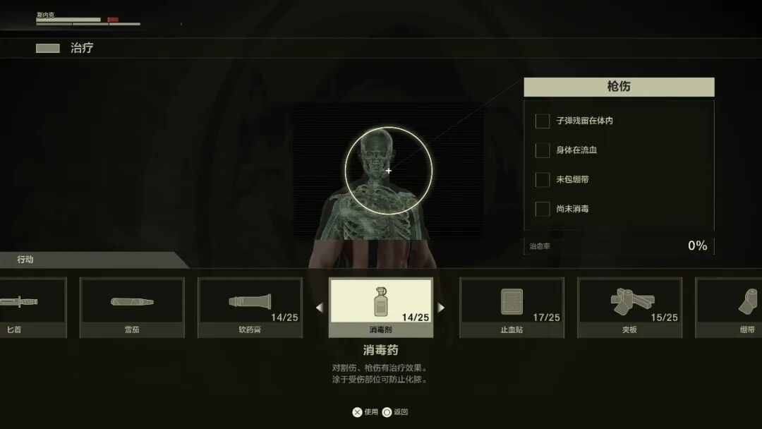 比如遊戲的生存系統,玩家必須時刻關注隨時間流逝而降低的“體力值”,一邊躲避敵人的同時一邊獵取食物,偶爾還要承擔吃壞肚子中毒的風險;受傷之後也必須針對不同傷口使用不同的醫療道具才能痊癒: