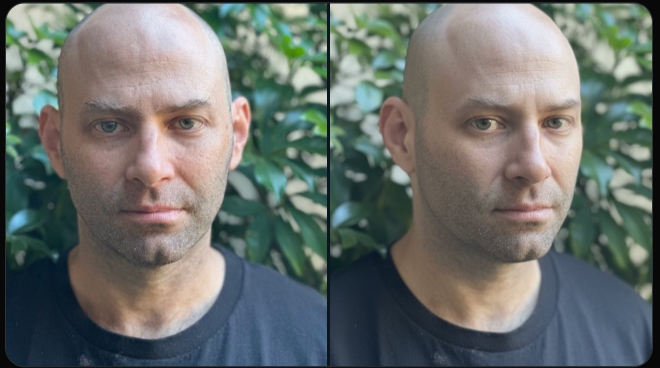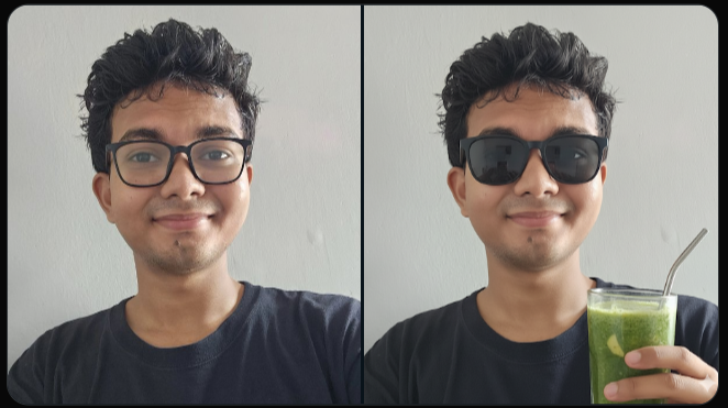 一個實戰例子可能説明不了什麼,咱們再來看幾個。這是一位國外網友用Nano Banana編輯的照片,他給出的指令是,“把眼鏡替換成黑色太陽鏡,然後拿一杯健康飲料”,Nano Banana給出了右邊的圖,不僅把臉型、表情、膚色都保留了下來,牆壁上小鼓包也還在,它還認真還原了墨鏡的半透明效果,以及鏡片上的反光,非常自然。