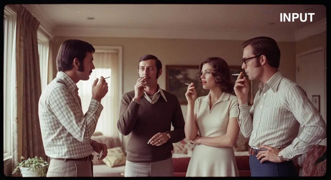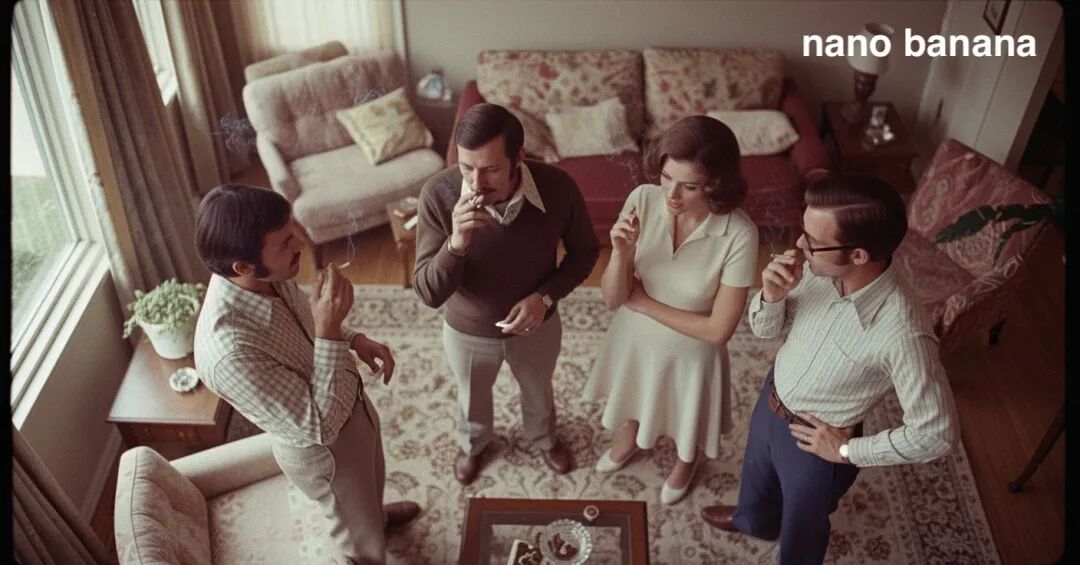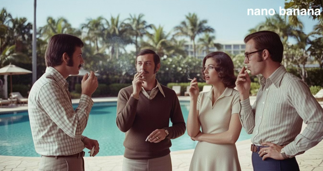 再看我們的主角Nano Banana,不僅把人物原樣照搬了下來,細節無一丟失,背景的色彩和清晰度也比較合適,可以説是非常接近老師傅手摳的結果了,而且它非常聰明地添加了,連原圖都沒有的煙霧效果,顯然Nano Banana是覺得,四個煙民站在這,空氣不可能清新,煙霧繚繞才合理。
