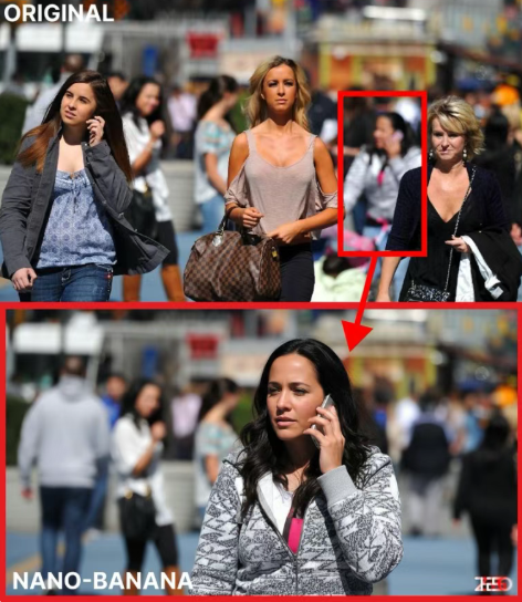 不僅如此,高手們還搗鼓出了無數的邪修玩法,比如説你可以給一張背景虛化掉的照片中,隨便畫一圈,把圈裏面模糊的人或者物提取出來,要求Nano Banana進行合理想象,生成這個人物的高清大圖,感覺刑警隊會很愛用。
