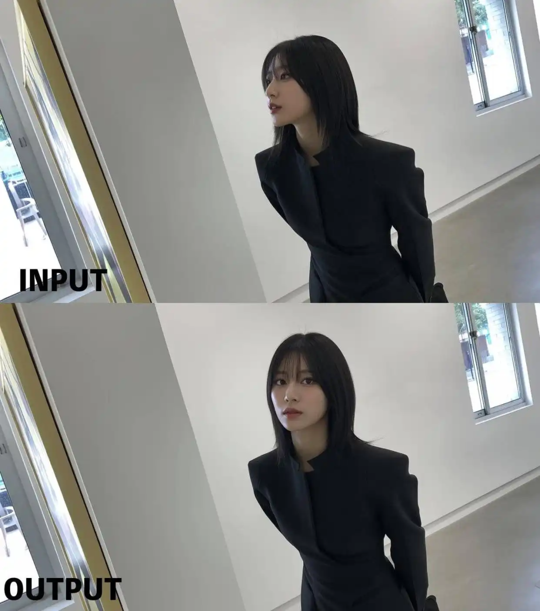 作為對比,完全一樣的參考和Prompt輸入GPT,結果是這樣的,莫名其妙給人物加了一層柔光濾鏡 ,還瘋狂磨皮,有種美顏拉到最大的感覺,而且人像的邊緣有條顯眼的黑線,像是摳出來放到牆壁前的樣子。
