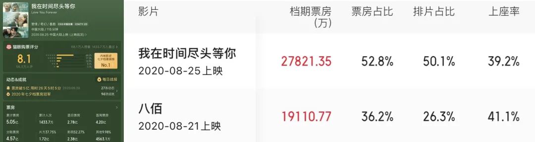 “七夕檔”,這個向來囊括在暑期檔裏、以往並未被單獨拎出來看待的小檔期,直到《我在時間盡頭等你》的出現,才正式被提出來作為一個重要營銷節點。