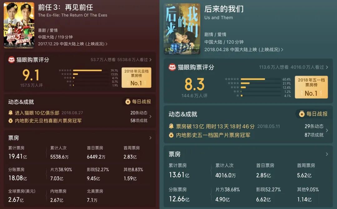 2017—2019年進入第二階段,“劇情+愛情”類型崛起。《前任3:再見前任》《後來的我們》等愛情片,單片票房突破十億,《前任3》還創造了種種營銷“壯舉”,比如“看前任,遇前任”“跟現任看前任,看完分手”等等,片中插曲《體面》《説散就散》唱到街知巷聞,最終票房19.41億。