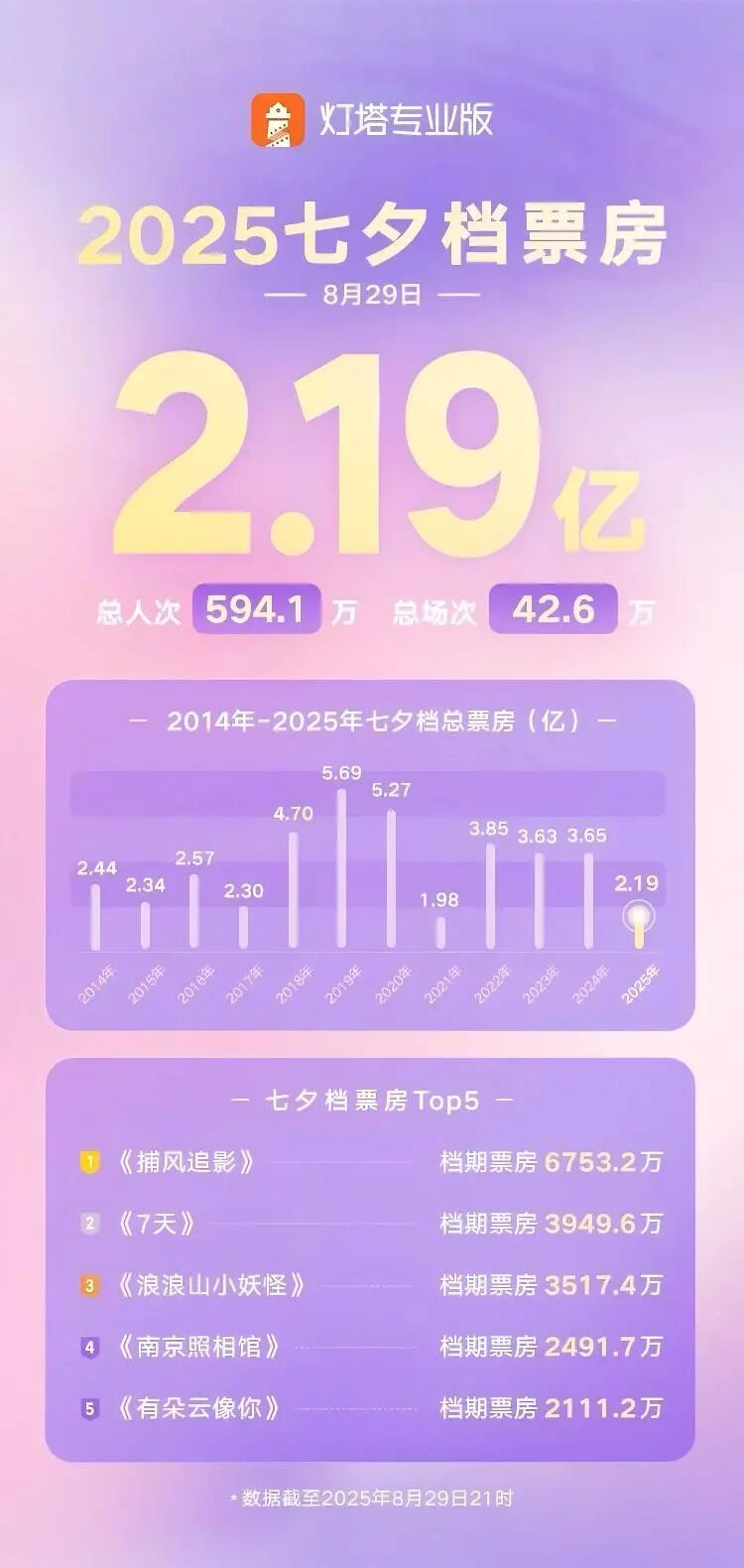 然而這些營銷大多是空有噱頭。今年七夕檔雖然營銷火熱,但最終七夕檔總票房只有2.19億,甚至不如去年的一半。《7天》《有朵雲像你》兩部七夕檔上映的愛情片單日總票房加起來,比不上已經上映兩週的《捕風追影》。