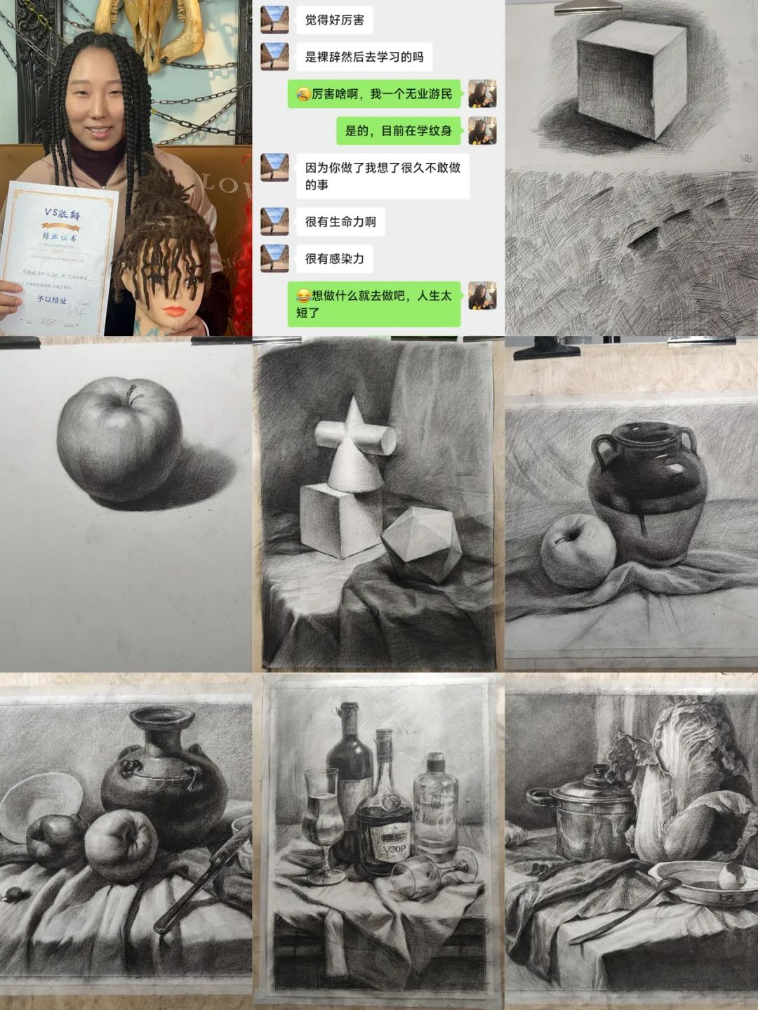 因為非洲髒辮的學習週期短,上手較快,同時髒辮和紋身顧客有所重疊,所以我先花了一週時間學習了髒辮課程。二月份我學完髒辮,三月初開始學紋身,現在已經五個月了,從素描基礎開始,還在努力中。
