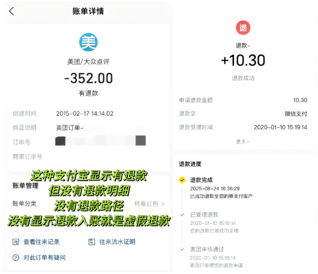 還有網友總結了經驗,退款顯示“有退款”,並且沒有退款路徑的,屬於“假退款”,真退款會顯示“已退回支付賬户”。
