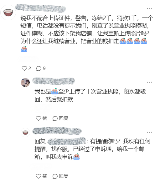 還有商家因為營業執照上傳不清晰被罰款1000元。