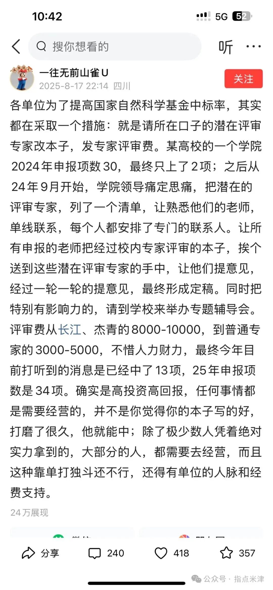 其實面對 “高校重金請評審專家改本子” 的消息,很多長期紮根科研一線的人,心裏都有兩層複雜的感受:一是 “不願信”,總希望這只是個別案例,而非普遍現象 —— 畢竟對大多數 “純靠自己” 的申請者來説,基金申報本就是一場 “用數月心血賭一個機會” 的硬仗,如果 “找關係改本子” 成了常態,那他們埋首查文獻、反覆打磨技術路線的努力,很可能會被 “人脈資源” 輕鬆抵消,這種 “努力不值錢” 的落差,足以澆滅很多青年學者的科研熱情;二是 “不得不信”,身邊偶爾傳來的零碎信息 —— 比如某同事 “找了領域內某老師把關後,本子一次就中”,或是某學院 “集中請專家指導後中標率翻倍”,都在隱隱印證這種操作的存在,讓人不得不直面現實的無奈。