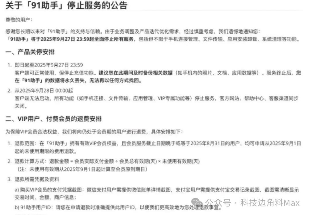 91助手日前官宣因業務調整及產品迭代優化需求,將於9月27日23時59分起全面停止所有服務,包括手機連接管理、文件傳輸、應用安裝卸載、系統清理等功能。即日起至9月27日23時59分,客户端可正常使用,但停止充值功能。9月28日0時起,客户端無法啓動,所有功能停止服務,官方網站、幫助中心、客服渠道同步關閉。