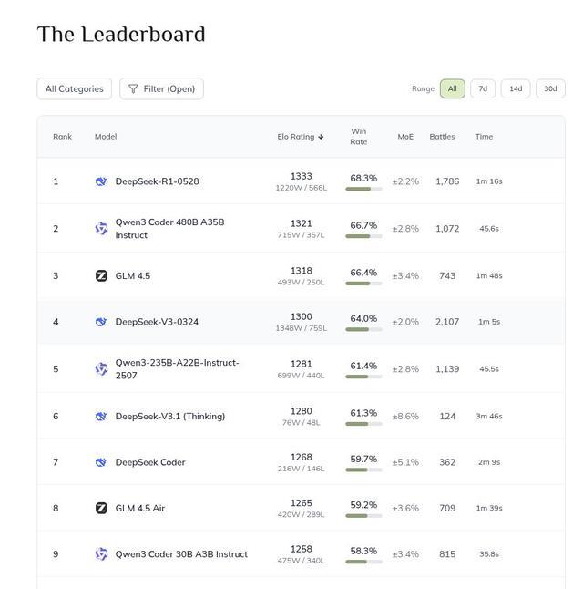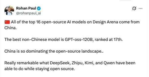 軟件工程師、自媒體作者 Rohan Paul 最近發現了一個令人震驚的現象:在 Design Arena 的排行榜上,排名前 16 的開源 AI 模型全部來自中國。最好的非中國模型——GPT-oss-120B——也只能排在第 17 位。