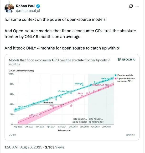 同時,這一榜單也為我們提供了一個觀察開源力量的絕佳窗口。開源模型在追趕前沿方面的速度極其驚人:能在消費級 GPU 上運行的開源模型,平均只比最尖端的閉源模型落後 9 個月;而在 o1 模型發佈後,開源社區僅僅用了 4 個月就迎頭趕上。