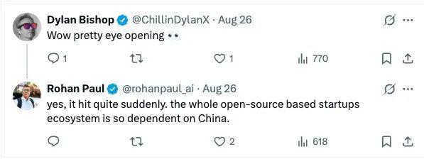 另一位網友 Dylan Bishop 則感嘆道:“太震撼了 。”Rohan Paul 回應稱:“是的,這幾乎是一夜之間發生的。整個依賴開源的創業生態,如今對中國的依賴已經如此之深。”