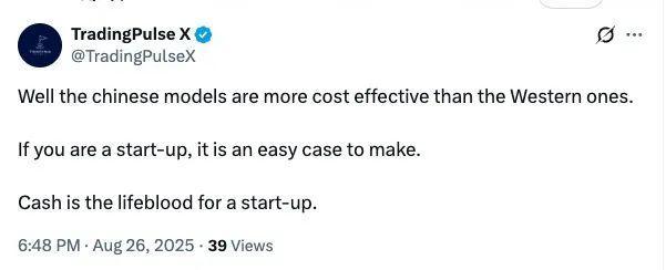 用户 TradingPulse X 在評論中寫道:“中國的模型比西方的更具性價比。如果你是一家初創公司,這幾乎是顯而易見的選擇。現金流才是創業公司的生命線。”
