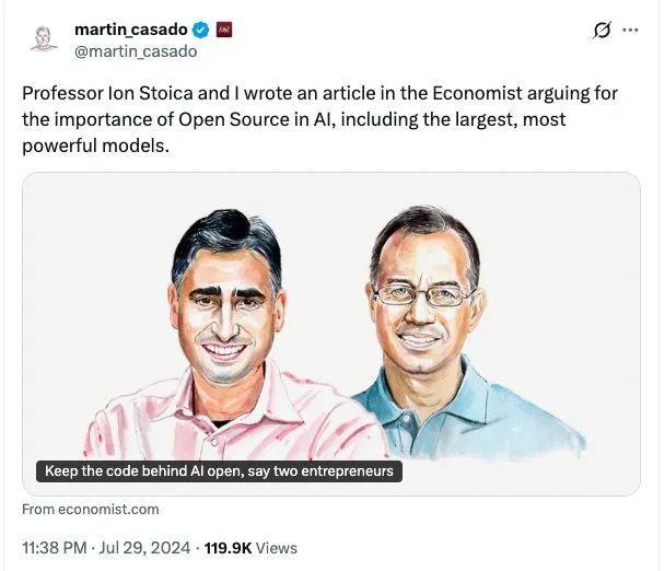 過去幾年,Casado 對開源的關注不斷加深。去年 7 月,他與 Ion Stoica(Databricks 聯合創始人、伯克利教授)在《經濟學人》上共同撰文,呼籲業界正視開源在 AI 中的重要性,“包括最大、最強的模型也應該開放。”