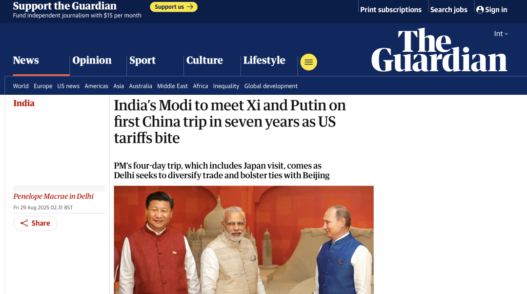 The article published by the Guardian discusses that Indian Prime Minister Narendra Modi is visiting China for the first time in seven years to attend the Shanghai Cooperation Organisation (SCO) summit with the leaders of China and Russia, at a moment when US-India relations are under severe strain.