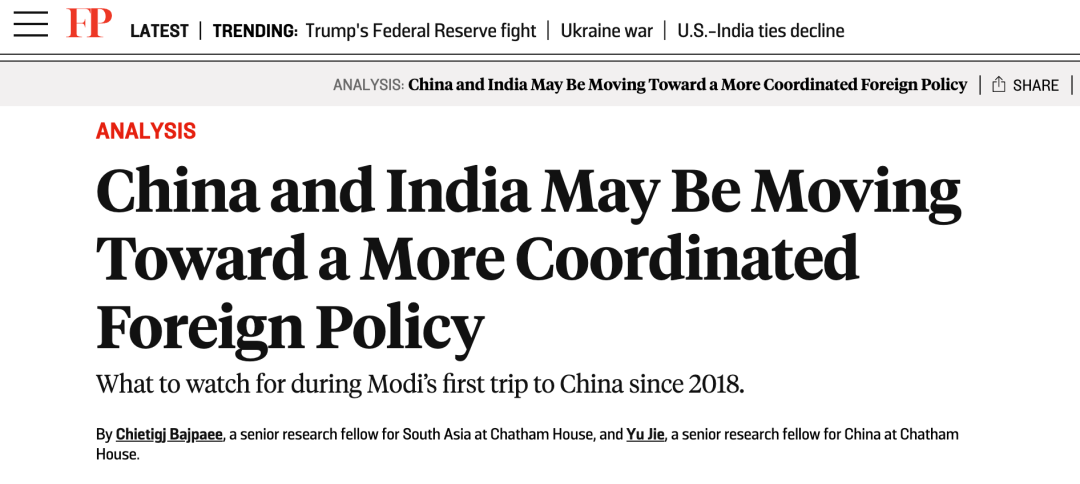 中印關係近期呈現回暖態勢。印度總理莫迪已抵達天津,開啓2018年後的首次訪華之旅,並與中國國家領導人舉行會晤。《外交政策》雜誌近期刊發題為《中印或許正在走向更加協調的外交政策》的文章指出,莫迪此次訪華顯示出兩國在務實與相互尊重的基礎上重塑外交關係的堅定意願。