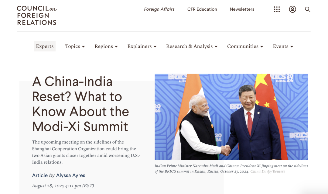 Indian Prime Minister Narendra Modi and Chinese President are set to meet on August 31, 2025, during the Shanghai Cooperation Organization (SCO) summit in Tianjin. This marks the first visit of either leader to the other’s country in six years and follows Chinese Foreign Minister Wang Yi’s recent trip to New Delhi, where he held talks with External Affairs Minister S. Jaishankar and National Security Advisor Ajit Doval. A commentary article titled “A China-India Reset?” published by Council onForeign Relations points out that their engagement comes at a sensitive moment where relations between India and the United States have been strained by new U.S. tariffs on Indian goods, fueling speculation that India might recalibrate its foreign policy approach.
