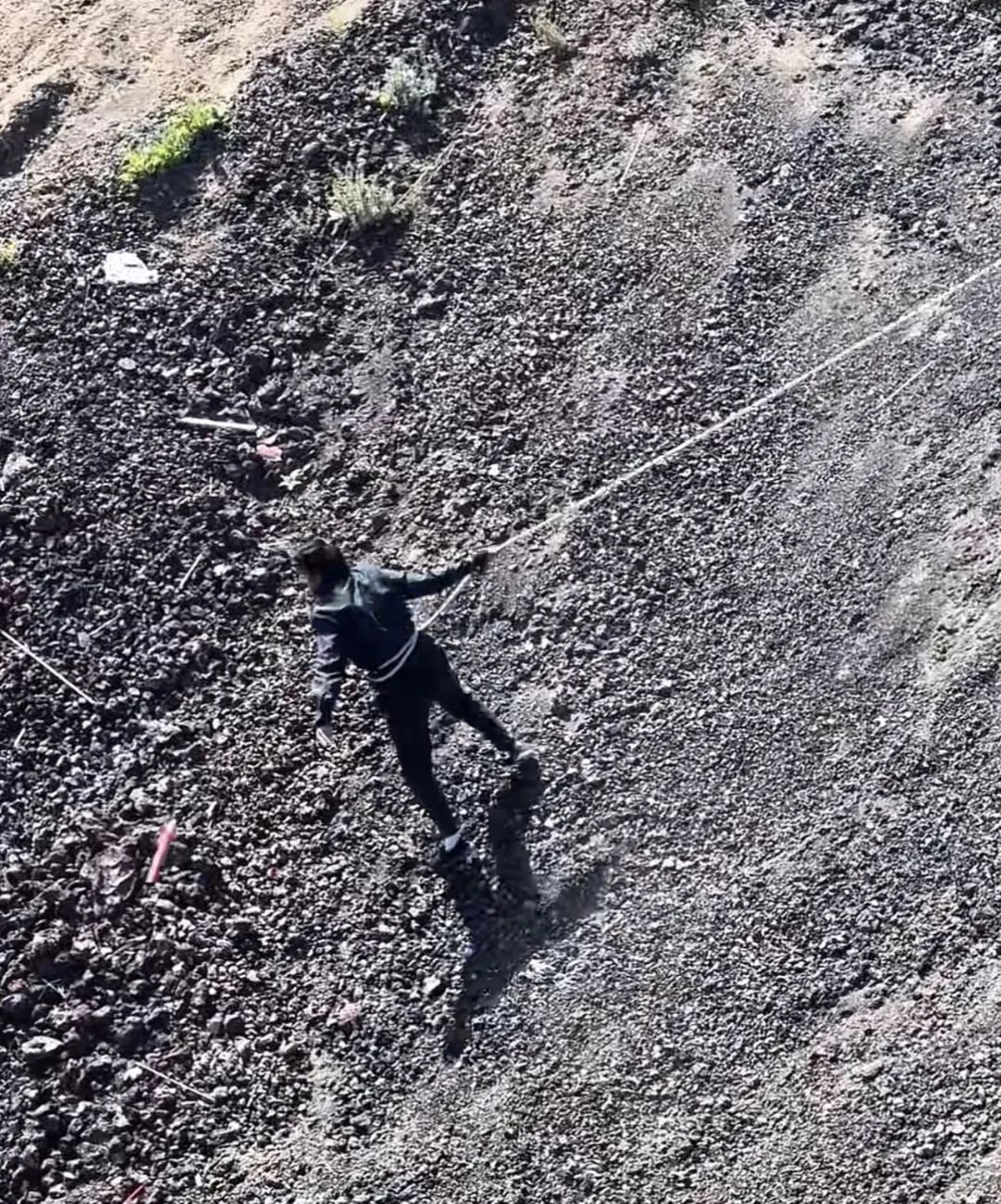 內蒙古烏蘭察布的火山,拍完宇航員照片的遊客,將廢棄冷焰火隨地亂扔,只能讓工作人員再吊着繩子下去一個個地撿在一起;