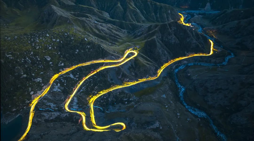 每當夜幕降臨,川流不息的車輛開着車燈行駛其間,獨庫公路彷彿一條逶迤的金色巨龍,盤繞在天山山麓,雄踞在西北邊陲。