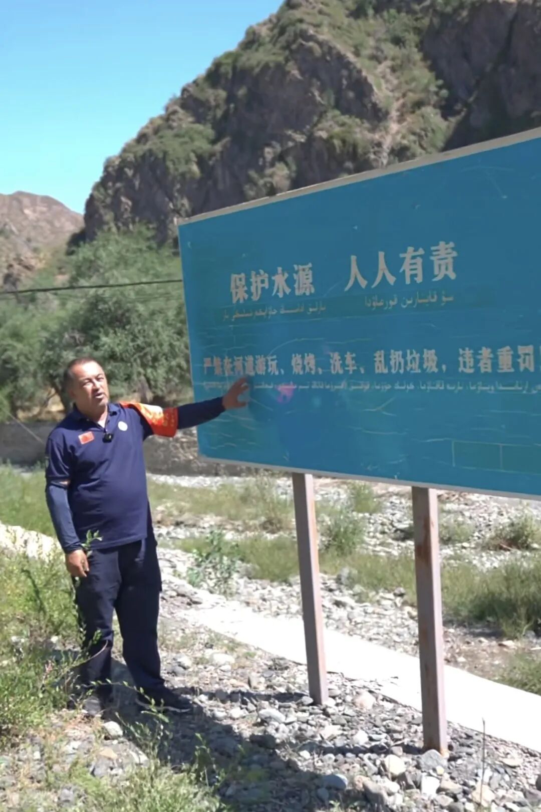 “保護水源,人人有責。嚴禁在河道……亂扔垃圾,違者重罰。”