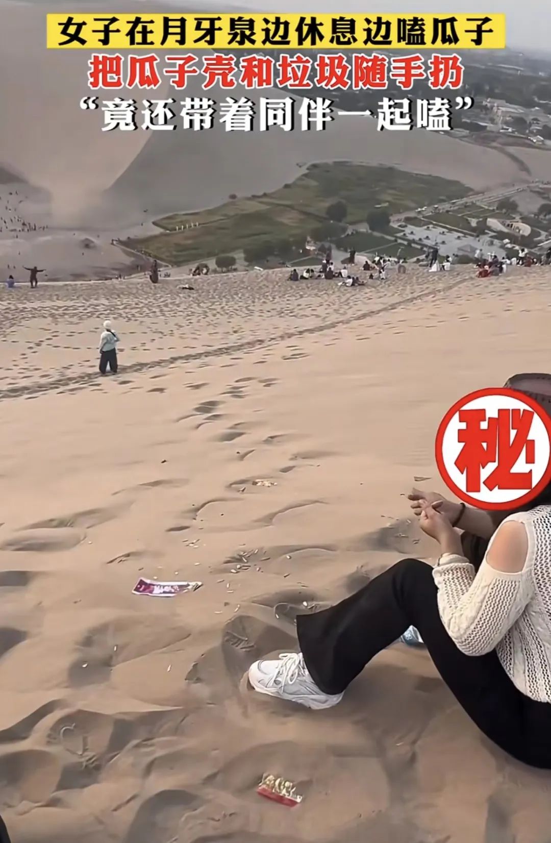 甘肅敦煌,月牙泉邊,有人邊休息邊嗑瓜子,將瓜子皮扔得到處都是;