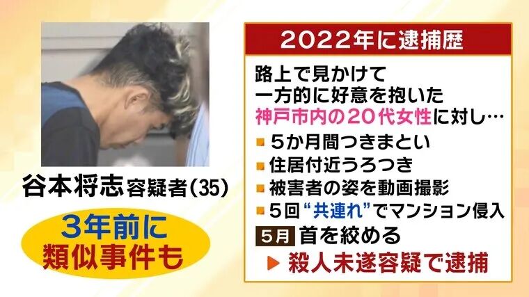 而事實上,這並不是谷本首次犯案。2020年,谷本將志因擅闖神戸市某公寓並尾隨女性,違反《跟蹤騷擾行為規制法》等,被處行政罰款。