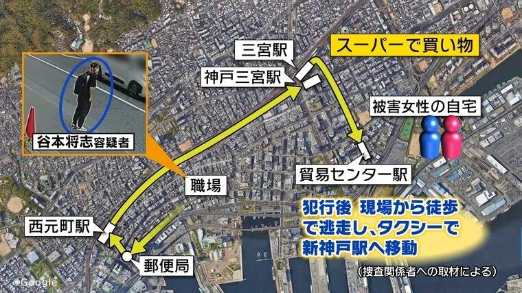 犯案後逃離現場的谷本一直逃跑,從新神户站乘坐新幹線前往東京,在JR奧多摩站下車,22日在奧多摩町的街道上被確認。