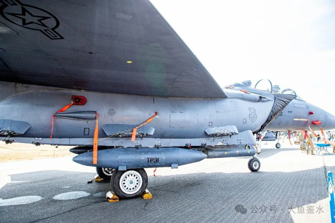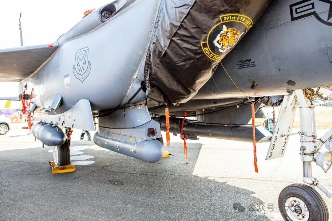 F-15E作為炸彈卡車的掛載能力在今天仍然是非常可觀的,最大載彈量10.4噸。這兩架飛機沒有攜帶武器,在左側進氣道下方掛載了“狙擊手”瞄準吊艙,右側進氣道下方掛載了“蘭盾”系統的AN/AAQ-13低空導航吊艙。保形油箱外側分別掛載了一具貨物吊艙,供飛行員轉場飛行時攜帶個人用品。