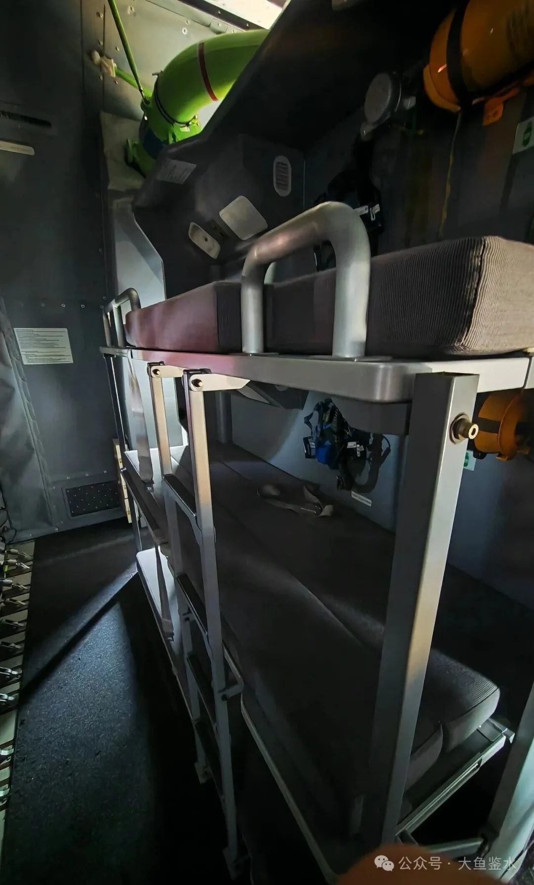 貨艙最前面用塑料布封着,只在右邊留了不到一人寬的開口,幾乎得擠過去。這塊塑料布里面是一個相當暗的區域,中間佈置了一張三層牀供機組長途飛行時休息,旁邊還有小廚房和盥洗室。KC-46A的標準機組就是3人制,2名飛行員和1名加油操作員,不過機組人員艙還可以佈置8個航空座椅,加上摺疊座椅最多可容納15名機組,安裝托盤座椅後貨艙可搭載58名乘客。