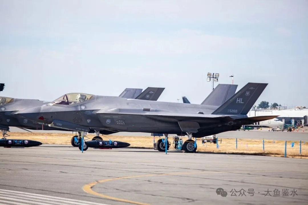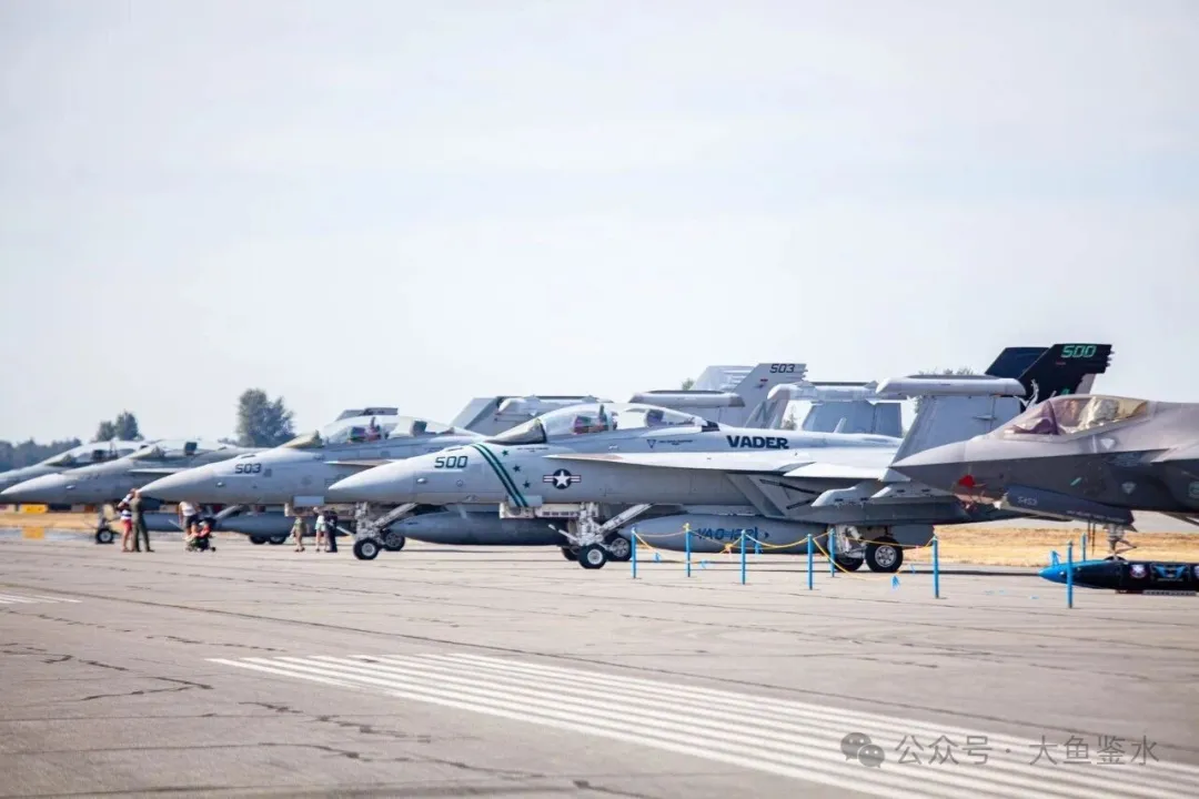 右邊一排是噴氣式戰鬥機,包括2架F-35A、2架EA-18G和2架CF-188。