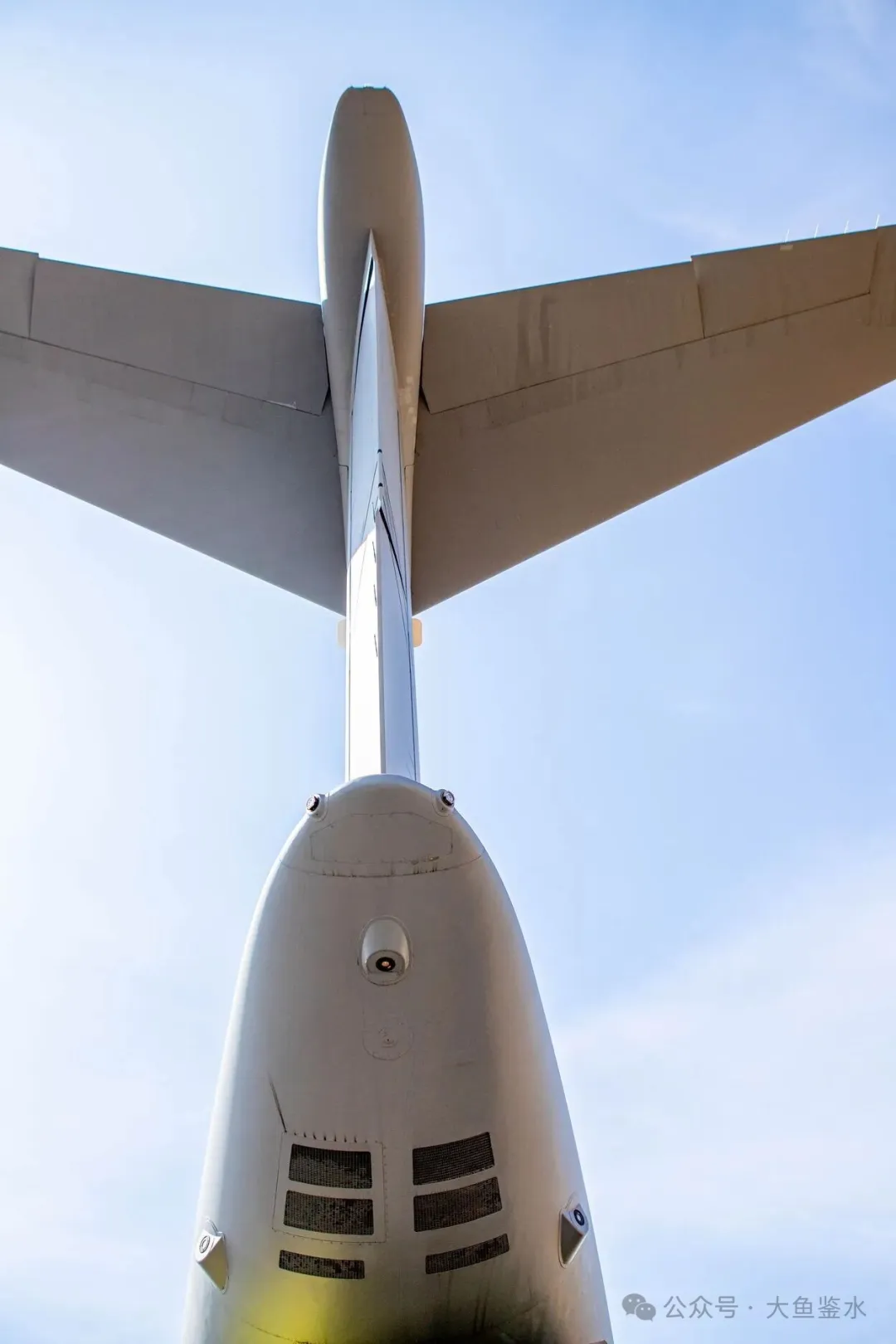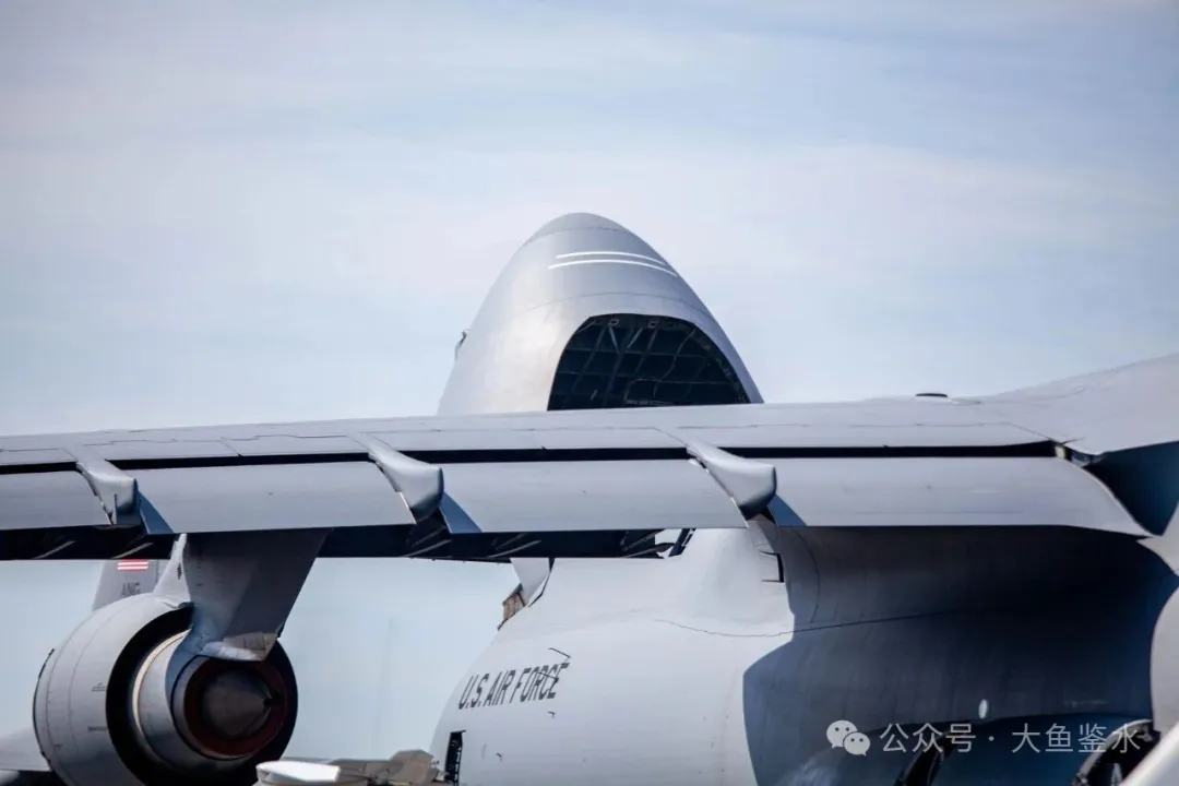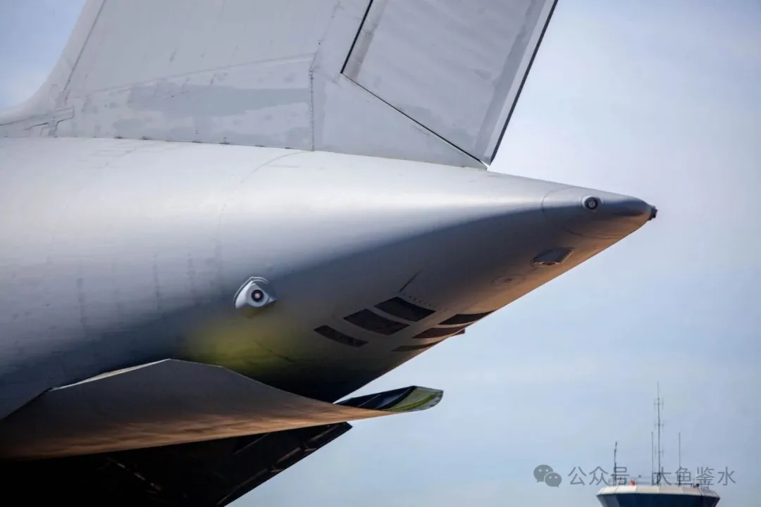 C-5M扁平的尾椎猶如鯊魚的頭部,前端兩側和底部安裝了3具AN/AAR-47導彈告警系統的光電探頭,尾門旁邊的鯊魚眼是LAIRCM系統的AN/AAR-54(V)紫外線探測器,它是AN/AAR-47的升級產品,同時安裝2套系統形成冗餘備份。