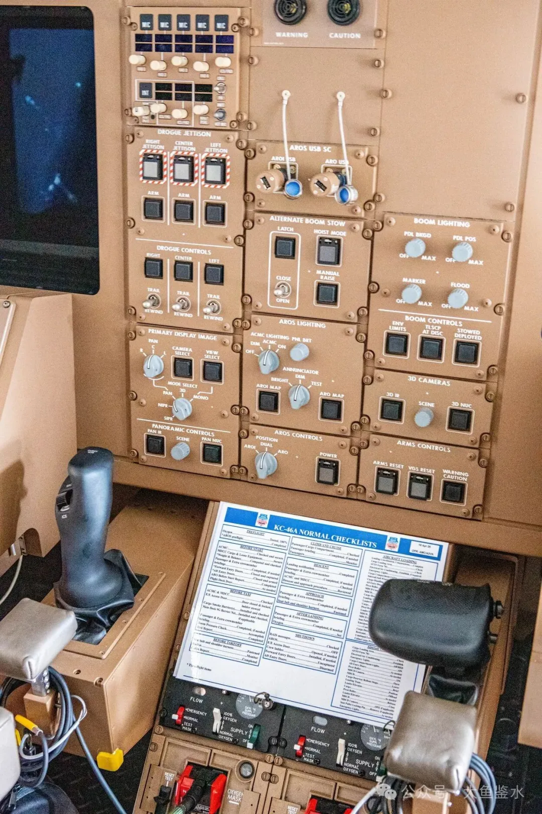 專門問了旁邊的機組人員能不能拍這個部分,他説可以。然後我問了幾個問題,他解釋只有下面的大屏幕是觸摸屏,其它都不是。中間凹進去的主顯示器就是立體顯示器,需佩戴3D眼鏡,不過可以在2D和3D之間切換。這套系統看着很科幻,但一直存在不少光學上的問題,尤其是受油部位處於高反差光照環境時操作員無法看清加油口,導致KC-46A遲遲無法實現完全作戰能力。