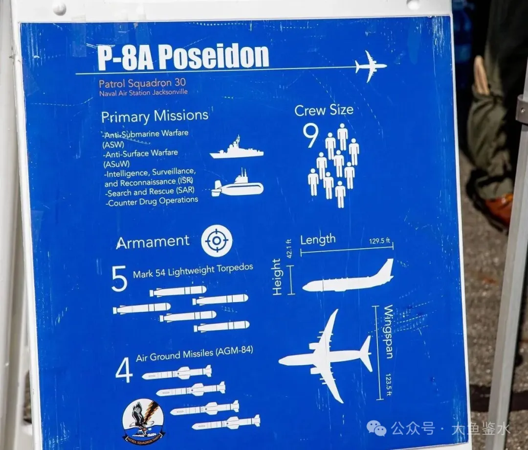 > 看板介紹P-8A機組乘員9人,可攜帶5枚Mk54輕型反潛魚雷和4枚捕鯨叉反艦導彈