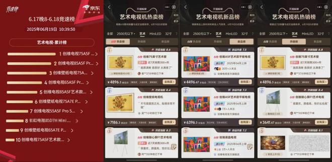 今年“618”期間,創維壁紙電視實現銷量,同比激增超120%,實現爆發式增長。在京東、天貓兩大平台,藝術電視品類榜單中,更是實現斷層式領先,百吋電視銷量同比增速也實超260%。