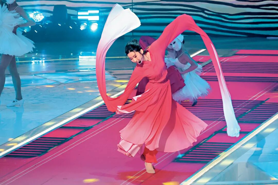 ▲岳飛後人嶽凡荻表演古典水袖舞蹈。